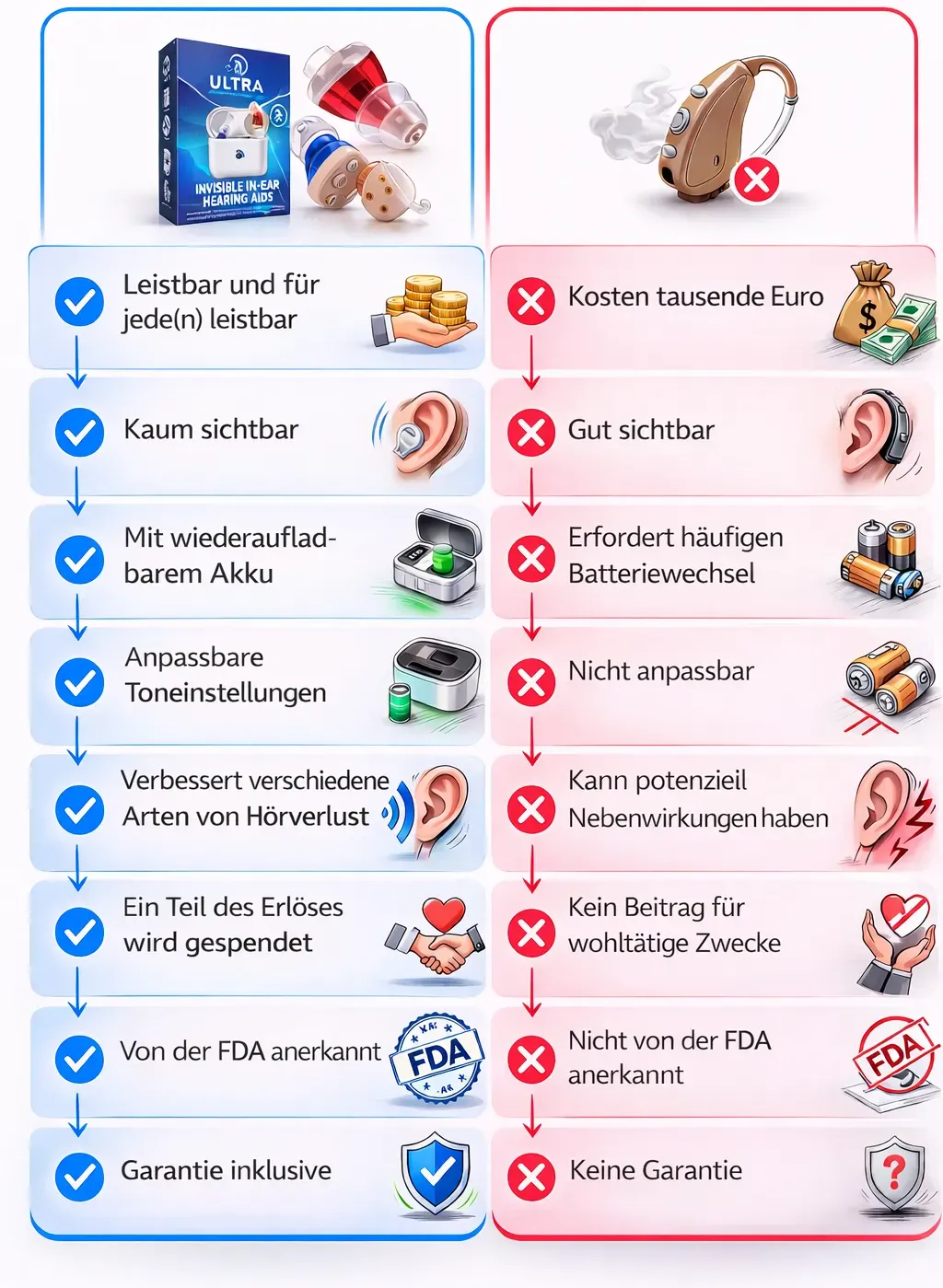 Die Ultra Hörgeräte sind bis zu 80 % günstiger als viele traditionelle Hörgeräte und bieten Premium-Qualität ohne Premium-Kosten.